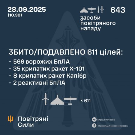 За попередніми даними, станом на 10.30, протиповітряною обороною збито/подавлено 611 повітряних цілей: