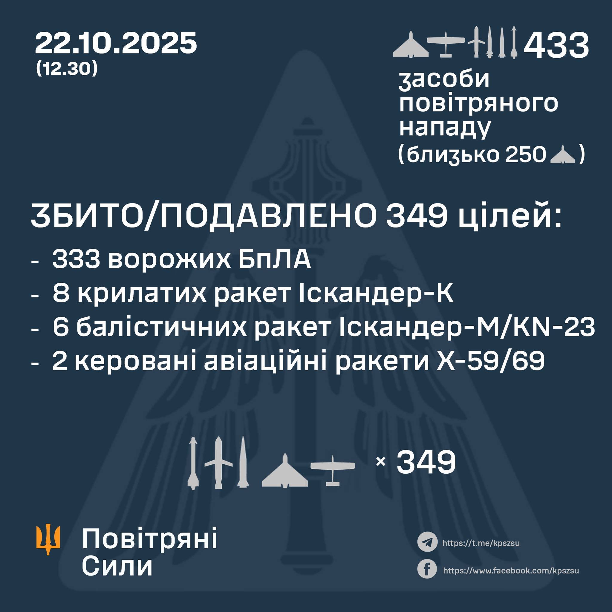 Загалом радіотехнічними військами Повітряних Сил виявлено та здійснено супровід 433 засоби повітряного нападу — 28 ракет (15 із них — «балістика») та 405 БпЛА різних типів. З них:
