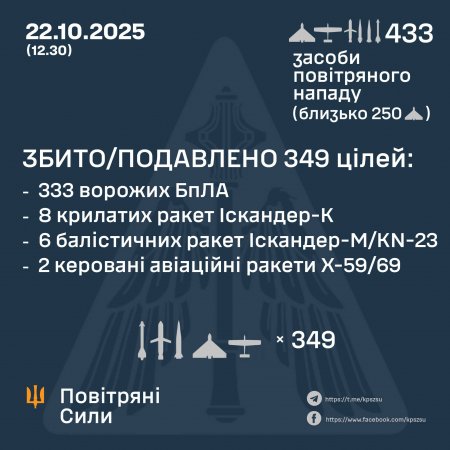 У ніч на 22 жовтня (з 19.00 21 жовтня) російська армія завдала комбінованого удару по об'єктах критичної інфраструктури України із застосуванням ударних БпЛА, ракет повітряного та наземного базування.