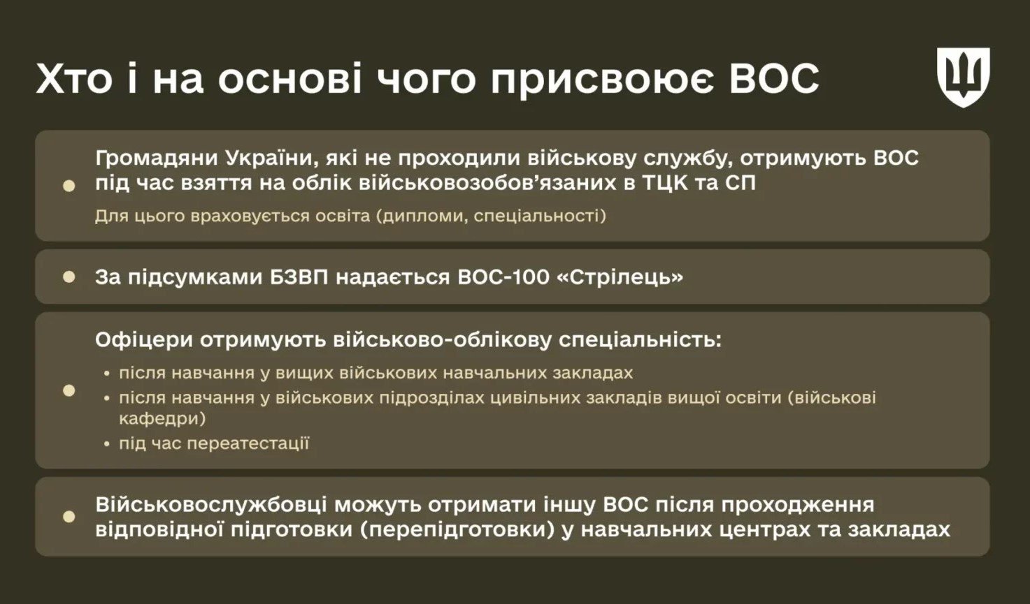 Громадяни України, які не проходили військову службу, отримують ВОС під час взяття на облік в територіальних центрах комплектування та соціальної підтримки (ТЦК та СП). При цьому враховується освіта (дипломи, спеціальності).
