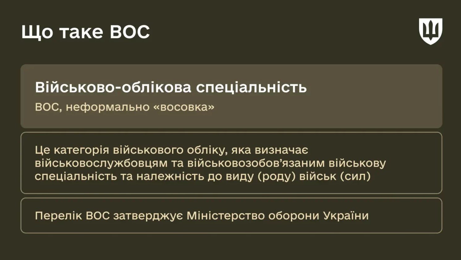 Військово-облікова спеціальність (ВОС) — це категорія військового обліку, яка визначає військовослужбовцям та військовозобов’язаним військову спеціальність та належність до виду (роду) військ (сил). Про них докладніше розповіли у Міноборони.
