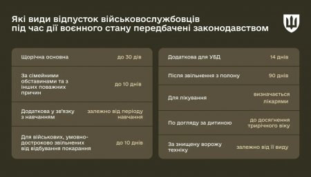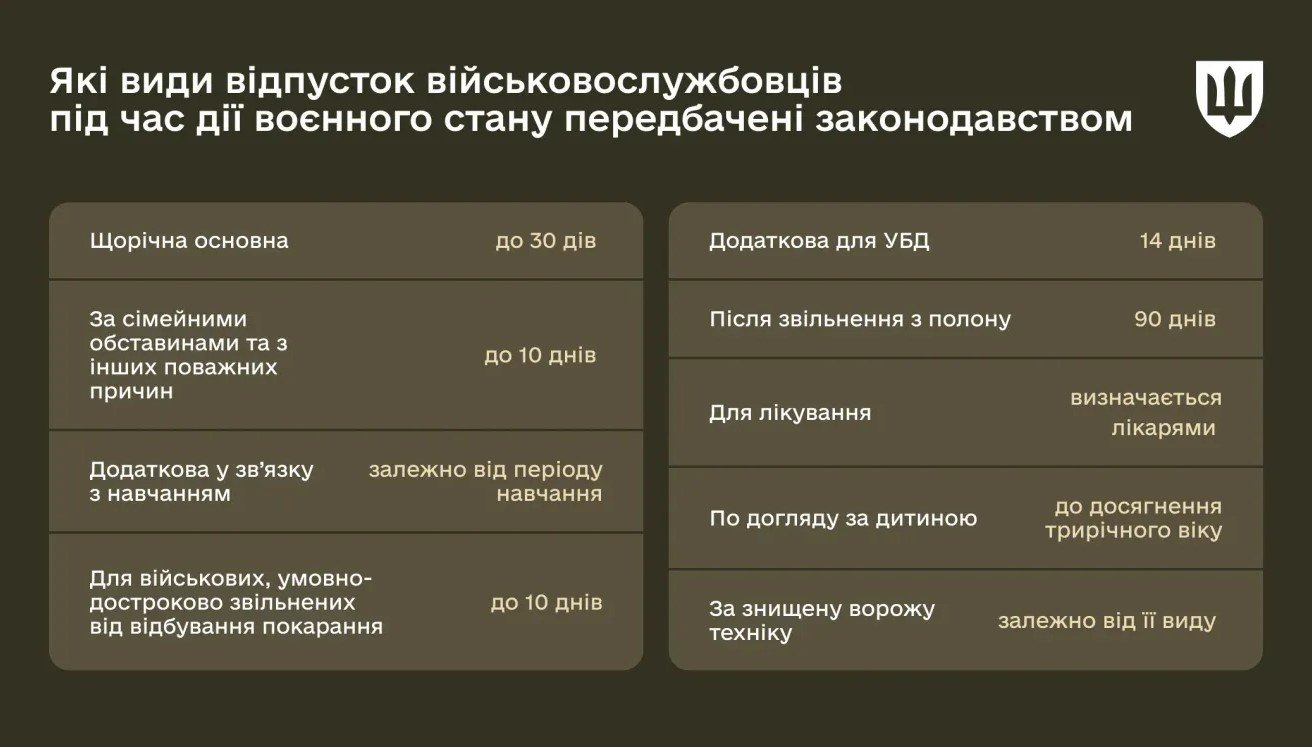 Право військовослужбовців на відпустки, їх види, порядок надання та тривалість регулює закон України «Про соціальний і правовий захист військовослужбовців та членів їх сімей». У Міністерстві оборони надали роз’яснення, на які відпустки мають право військові під час дії воєнного стану.