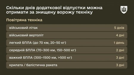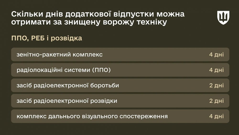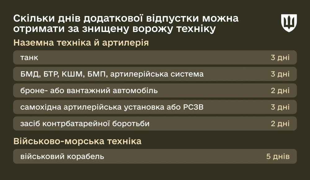 Військовослужбовцям надається додаткова відпустка за знищену ворожу техніку. Її загальна тривалість не повинна перевищувати 15 календарних днів на рік і залежить від виду знищеної техніки.