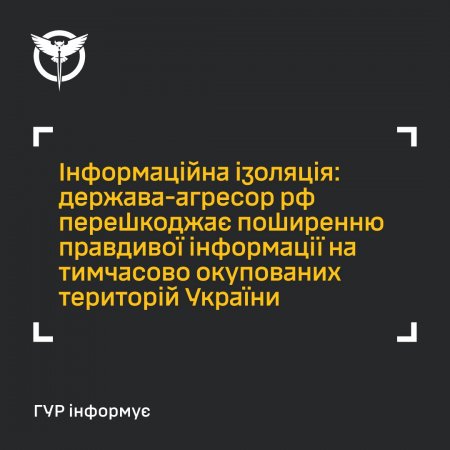 Росія все більше вганяє населення тимчасово окупованих територій України в інформаційну ізоляцію. На цю територію майже неможливо додзвонитися, там не працює більшість месенджерів, а інформація подається виключно від російських джерел та з відповідним наголосом кремлівської влади. Тобто, держава-агресор перешкоджає поширенню правдивої інформації на тимчасово окупованих територіях України. Про це сьогодні повідомило Головне управління розвідки Міністерства оборони України.