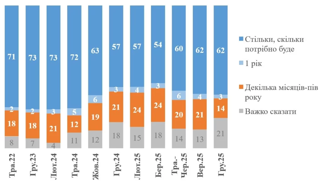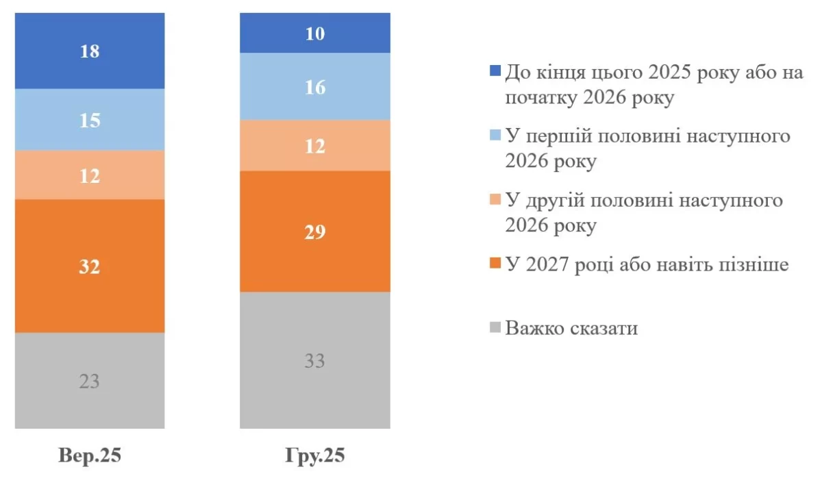 Лише 10% опитаних очікують завершення війни до кінця 2025 року або на початку 2026-го. У вересні таких було більше — 18%.