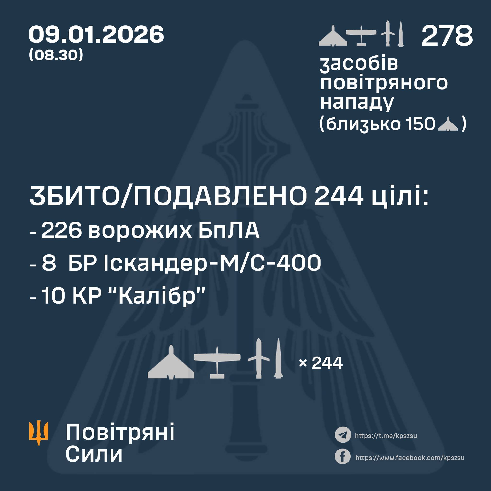 За попередніми даними, станом на 09.00, протиповітряною обороною збито/подавлено 244 повітряні цілі: