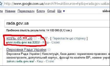 В частности, пресс-секретарь компании ‘Гоу Огле’ Аратозов отметил, что издевательские формулировки по отношению к украинскому парламенту можно было найти только при поиске через Google, и при этом Google Inc. не приложила усилий к тому, чтобы оперативно разрешить создавшуюся ситуацию – переход при поиске сервера ВР на поисковике Google на нецензурное выражение в адрес украинского парламента провисел более 2 суток.