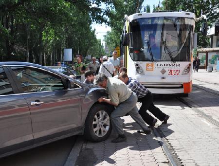 Автомобиль Mazda CX7 перекрыл движение трамваю №1 в Донецке, из-за чего движение трамваев по этому маршруту было остановлено более чем на 20 минут.