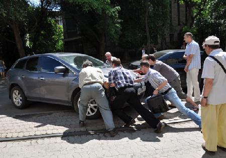 Возмущенные пассажиры, не дождавшись сотрудников ГАИ или хозяина автомобиля, приняли решение своими силами откатить автомобиль с тротуара.