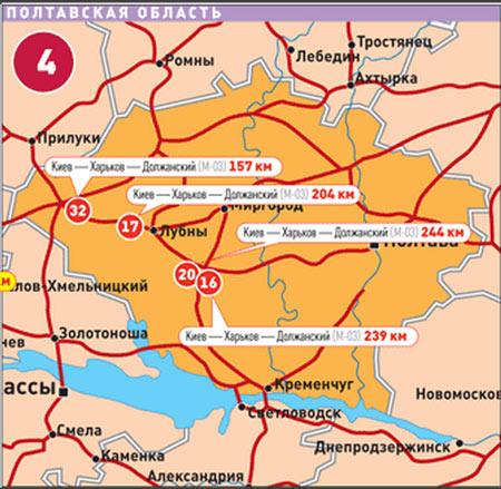 Полтавская область заняла 4 место по количеству смертей на 100 тысяч автомобилей (показатель - 79,5). Также наш регион страл третьим в рейтинге по протяжности дорог без разметки. У нас таких дорог 3776,1 км. Определены и самые опасные участки на дорогах Полтавщины - на карте они изображены красными кружочками. В кружочках - число ДТП за 2008-2010 года. Всего опасных участков в Полтавской области - 4 - по трассе Киев-Харьков-Довжанский (М-03):