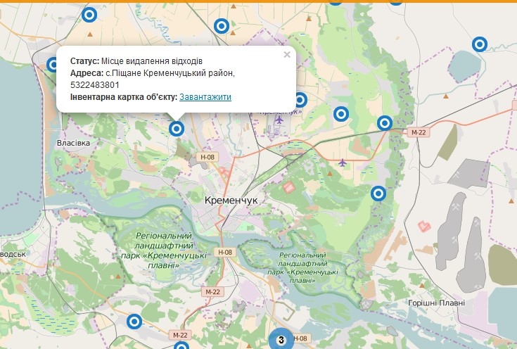 Навколо Кременчука, згідно з картою, існує 10 сміттєвалищ: у Піщаному, П'ятихатках, Рокитному, Щербаках, Потоках, Білецьківці, Підгірному, Садках, Ройовому, Буртах