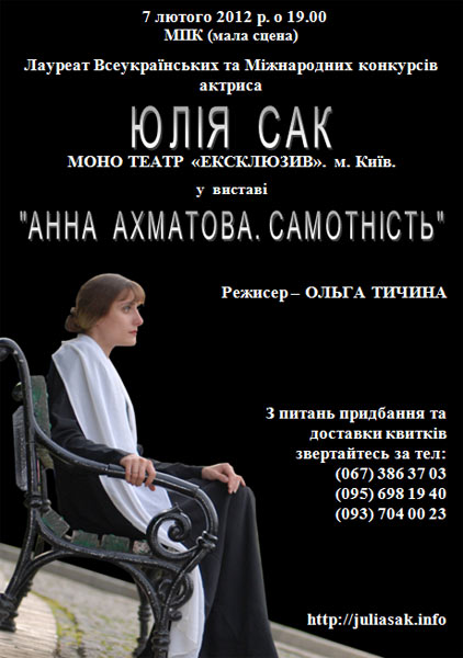 Представляет киевский моно-театр «Эксклюзив». Роль исполняет лауреат Всеукраинских и Международных конкурсов актриса Юлия Сак. Режиссёр – Ольга Тычина.