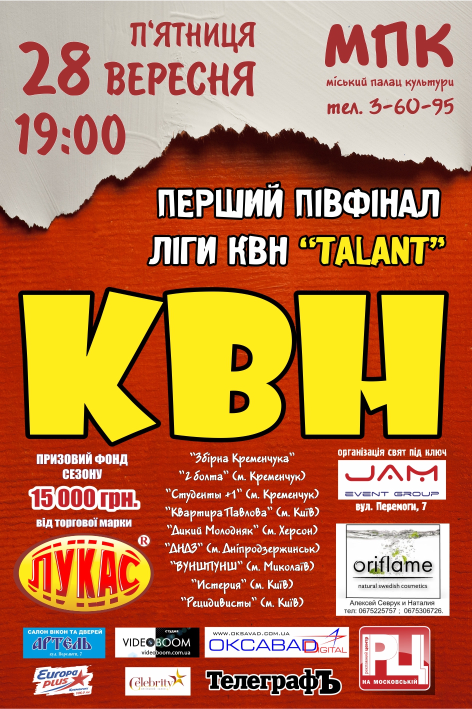 28 сентября. Кременчугская лига КВН «Талант» Первый полуфинал. Играют команды из Кременчуга, Херсона, Киева, Днепродзержинска и Николаева.