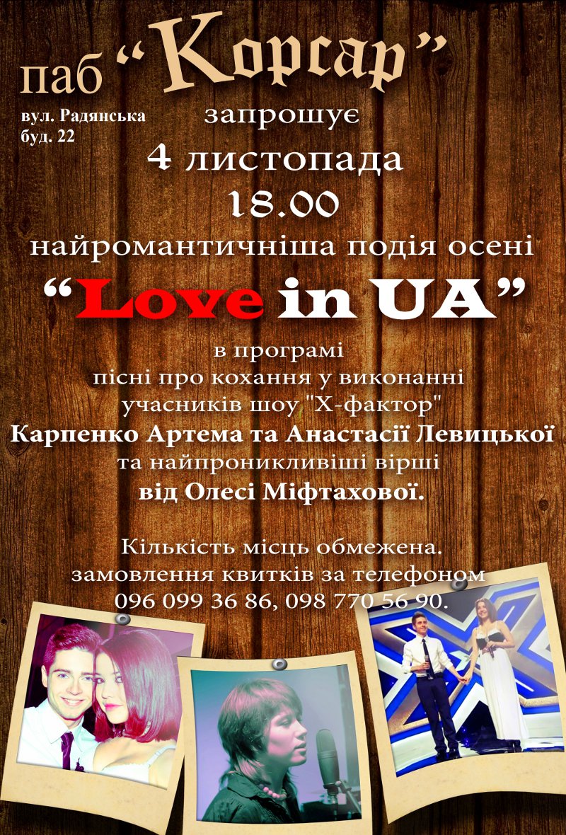 2-часовая программа из отечественных и зарубежных хитов о любви в исполнении дуэта Артёма Карпенко и Анастасии Левицкой, а также лирики Олеси Мифтаховой