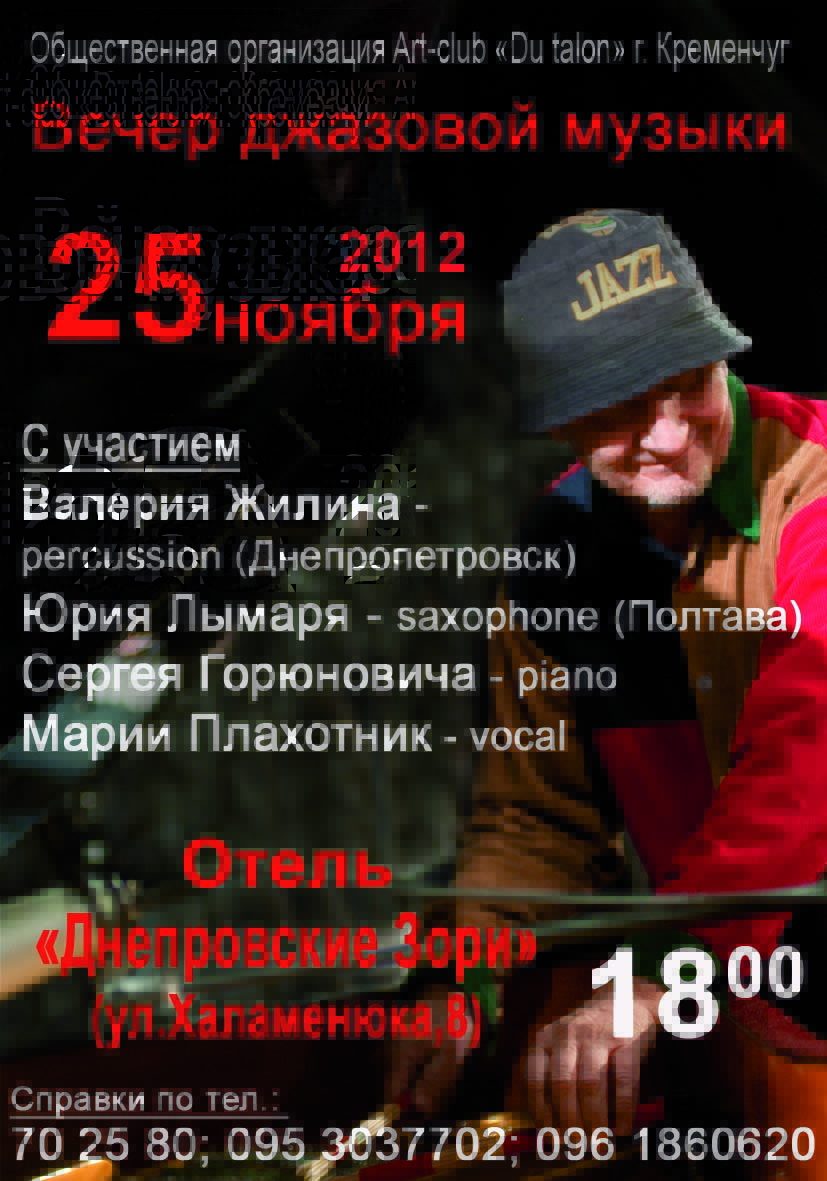 Джазовые стандарты, импровизации, электронно-акустическая музыка, видео-инсталляции, free-jazz, венецианские маски. Участвуют Валерий Жилин (ударные, Днепропетровск), Юрий Лымарь (саксофоны, Полтава).