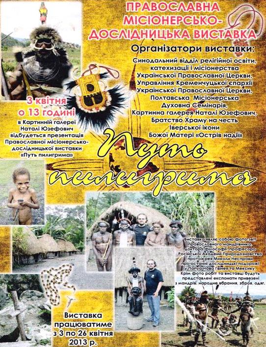 Выставка «Путь пилигрима» – фотоотчет православного путешественника Николая Несправы, о последних исследовательских путешествиях в Папуа Новую Гвинею и Мексику. Кроме фоторабот на выставке будут представлены экспонаты, привезенные из странствий: народные наряды, оружие