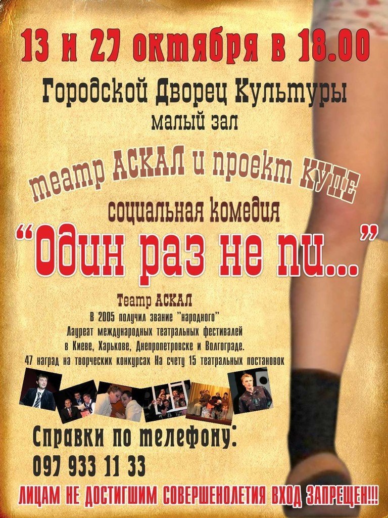 ТЕАТР «АСКАЛ» представляет второй спектакль театрального сезона – скандальную социальную комедию «ОДИН РАЗ НЕ ПИ…»!