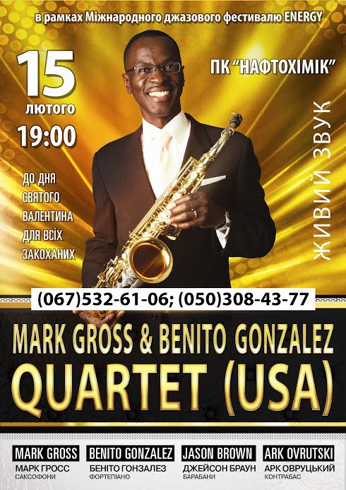 Ко Дню Святого Валентина, 15 февраля, в рамках украинского тура, Кременчуг посетит солист легендарного оркестра Дюка Эллингтона, обладатель двух премий Гремми Марк Гросс (Mark Gross, саксофоны, США) в содружестве с известным в США пианистом Бенито Гонзалесом (Benito Gonzalez).