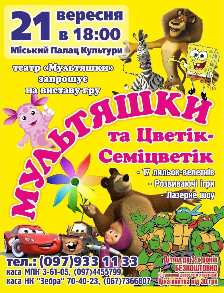 Заказ билетов по тел. (097) 933 11 33, касса МПК 3-61-05, (097) 4455799; касса НК «Зебра» 70-40-23, (067) 7366807. Детям до 3-х лет БЕСПЛАТНО (в сопровождении взрослого с билетом)! Цена билета от 30 грн.
