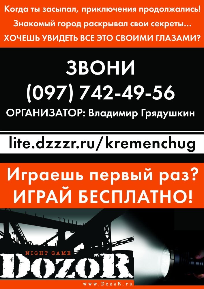 Интеллектуальная ночная автомобильная игра DozoR – старт в 22-00… Думай! Быстрей-быстрей! Жми на газ! Карта города… Здесь ты еще не был никогда, знакомый город раскрывает свои секреты… Неожиданные встречи, загадки, озарение, адреналин, свет фонарей… Ты первый! И спать совсем уже не хочется! Сереет небо и вот – костер на берегу, десятки машин, эмоции через край до рассвета, шампанское из кубка, и даже тот незнакомый человек, который бежал рядом с тобой, становится твоим другом. И вы, такие разные, вдруг поняли, что этой ночью пережили большое приключение и следующие дни наполнены ожиданием Игры…