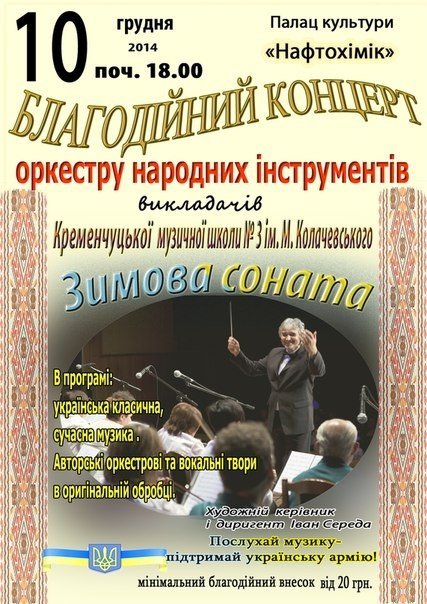10 декабря в ДК «Нефтехимик» пройдет благотворительный концерт оркестра народных инструментов преподавателей Кременчугской музыкальной школы № 3 им. Колачевского.