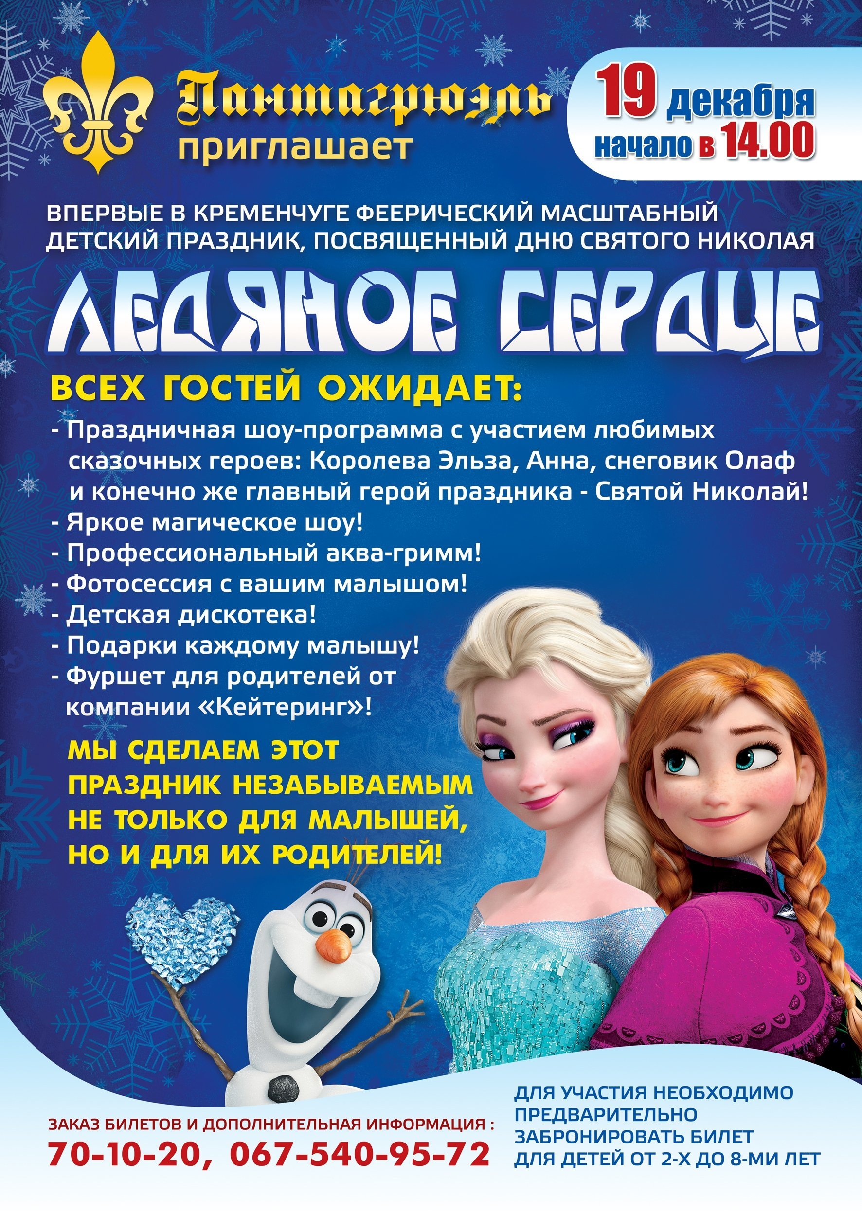 Вас ждет яркая развлекательная программа: магическое шоу, дискотека, аква-гримм и конечно же подарки! Специально для родителей подготовлен праздничный фуршет от компании «Кейтеринг». Для дополнительной информации обращайтесь по телефонам: 70-10-20; 067-540-95-72; 096-483-36-65
