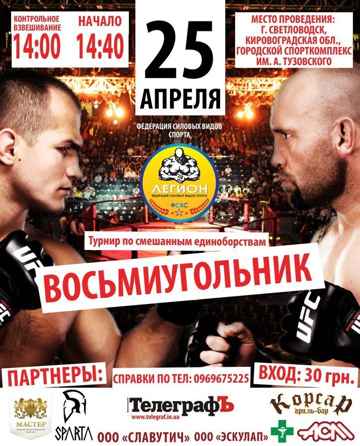25 апреля в Светловодске в городском спорткомплексе им. А. Тузовского пройдет турнир по смешанным единоборствам в восьмиугольнике. Организатором соревнований выступает Федерация силовых видов спорта «Легион».