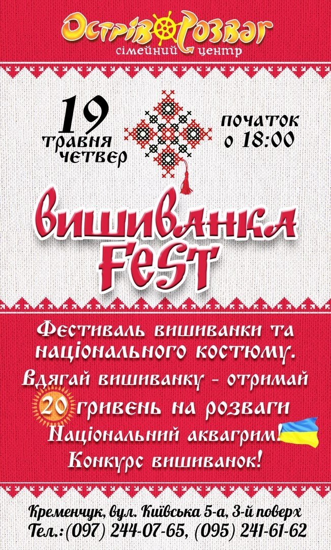 19 мая в Кременчуге, в «Острове Развлечений» пройдет фестиваль вышиванок и национального костюма. Надевай вышиванку – получи 20 гривен на развлечения!