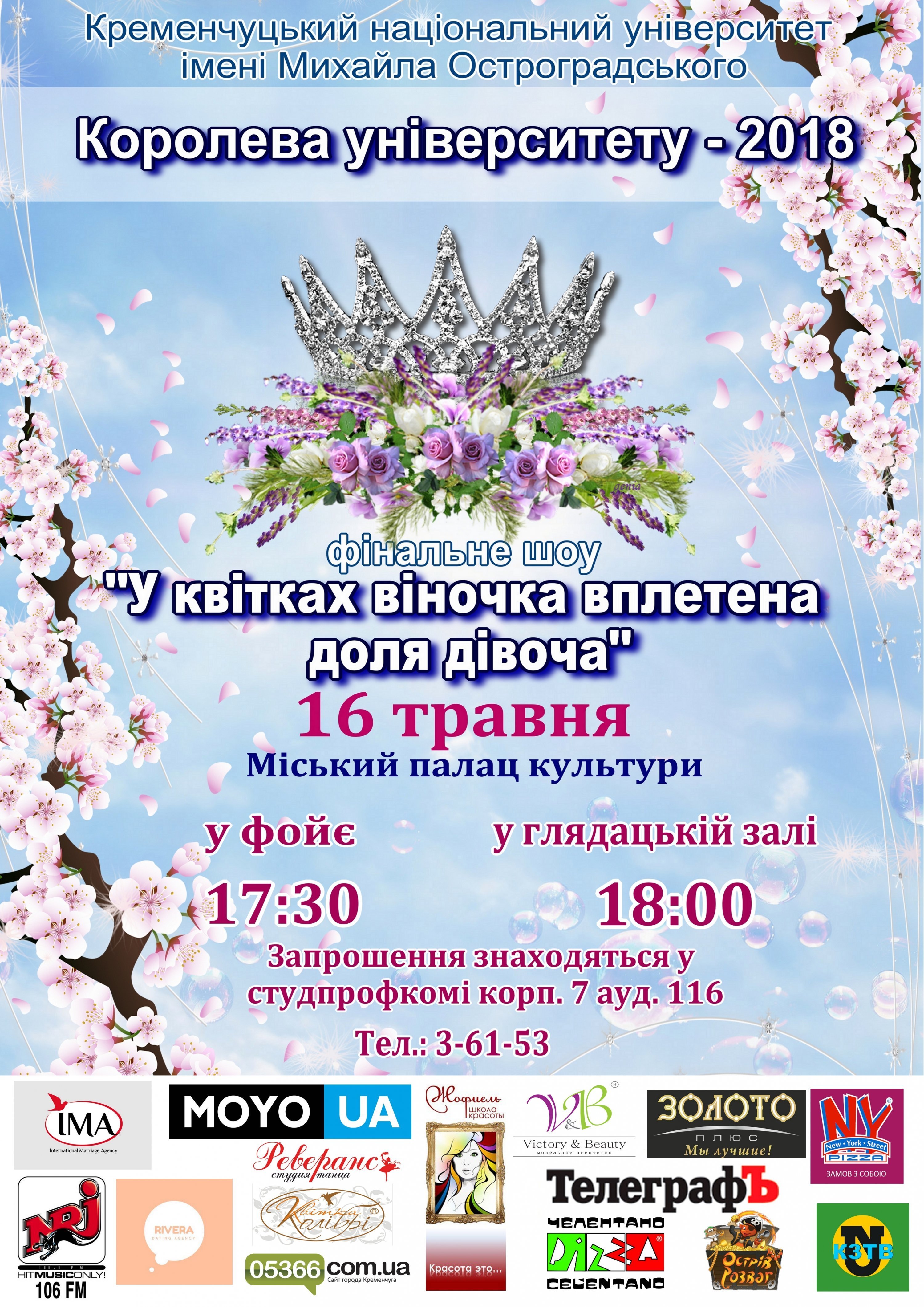 Що: Фінальне шоу відкритого конкурсу «Королева університету-2018» Де: МПК Коли: 16 травня, о 17.30 (фойє), 18.00 (глядацький зал)