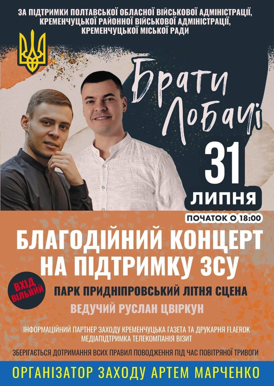 Кременчук, запрошуємо всіх на благодійний концерт, який відбудеться 31 липня, в неділю о 18.00 в Придніпровському парку. Концерт благодійний, під час якого буде відбуватися сбір коштів на підтримку ЗСУ. Організатор заходу – волонтер Артем Марченко.