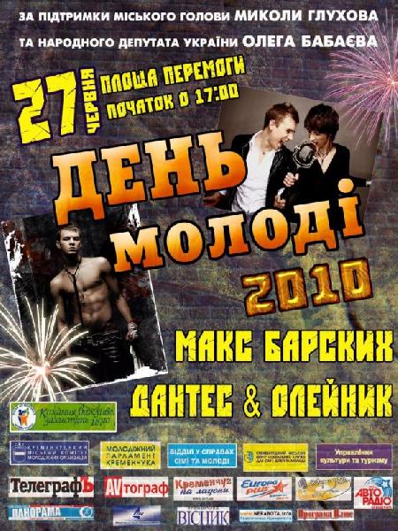 Что: Празднование Дня Молодёжи в Кременчуге. Выступления кременчугских коллективов, звёзд украинской эстрады (финалисты «Фабрики звёзд» Макс Барских и Дантес&Олейник. Пришедших ожидает разъяснение новых законодательных норм, которые ограничивают употребление алкогольных напитков и сигарет в общественных местах. В 19.00 состоится «танцевальный флешмоб».