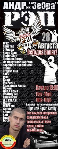 Under Side, Тристар, 2-Удара, Koms Clan, Мс СаКуР & Мс SopraNo, Добрые Люди, B92, Коренное Население, Stimul, Projekt BSA, S.N.S., МАК, Крэд. Орион, Козырная Карта, Д.О.Р.И.А.Н, Мс Pazоn, SHKeD, Бэст, Сhorniy mc, Три Масти, Brave, Факт mc, Брест, ДЯДЯ СЁМА, Трио и другие…
