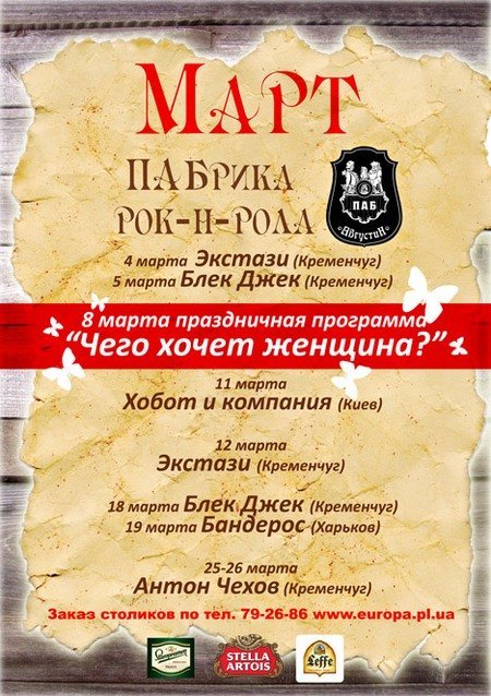 Расписание вечеринок в марте: Ecstasy, Блек Джек, Хобот и компания, Бандерос и Антон Чехов.