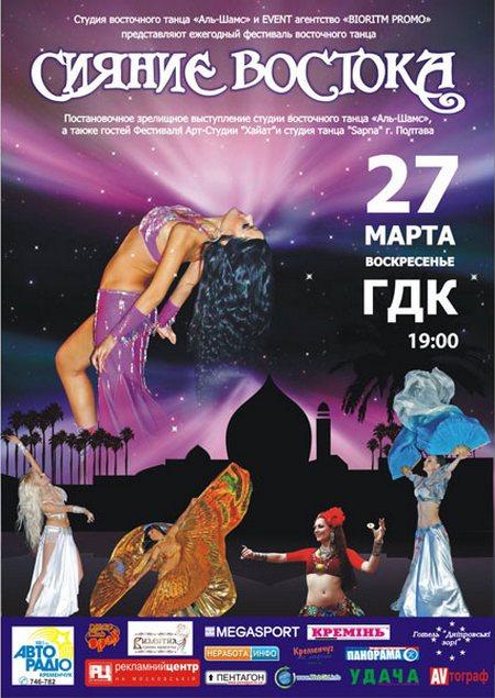 Что: Фестиваль восточного танца «Сияние Востока». Выступают воспитанники кременчугских студий танца «Аль-Шамс», «Хайат», а также полтавской «Sapna».