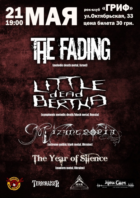 Что: Рок-клуб «Гриф» приглашает на концерт металл-групп из Украины, России и Израиля: LITTLE DEAD BERTHA (symphonic melodic death/black metal, Russia), THE FADING (melodic death metal, Іsrael), MIZANTROPIA (extreme gothic/dark metal, Ukraine), THE YEAR OF SILENCE (modern metal, Ukraine).