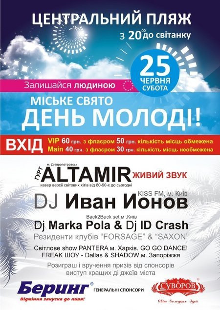 21.00 – 23.00: живой звук., концерт группы «ALTAMIR» г. Днепропетровск. (Кавер версии мировых хитов от 80-90-х до сегодня). Фешн показ от бутиков города.
