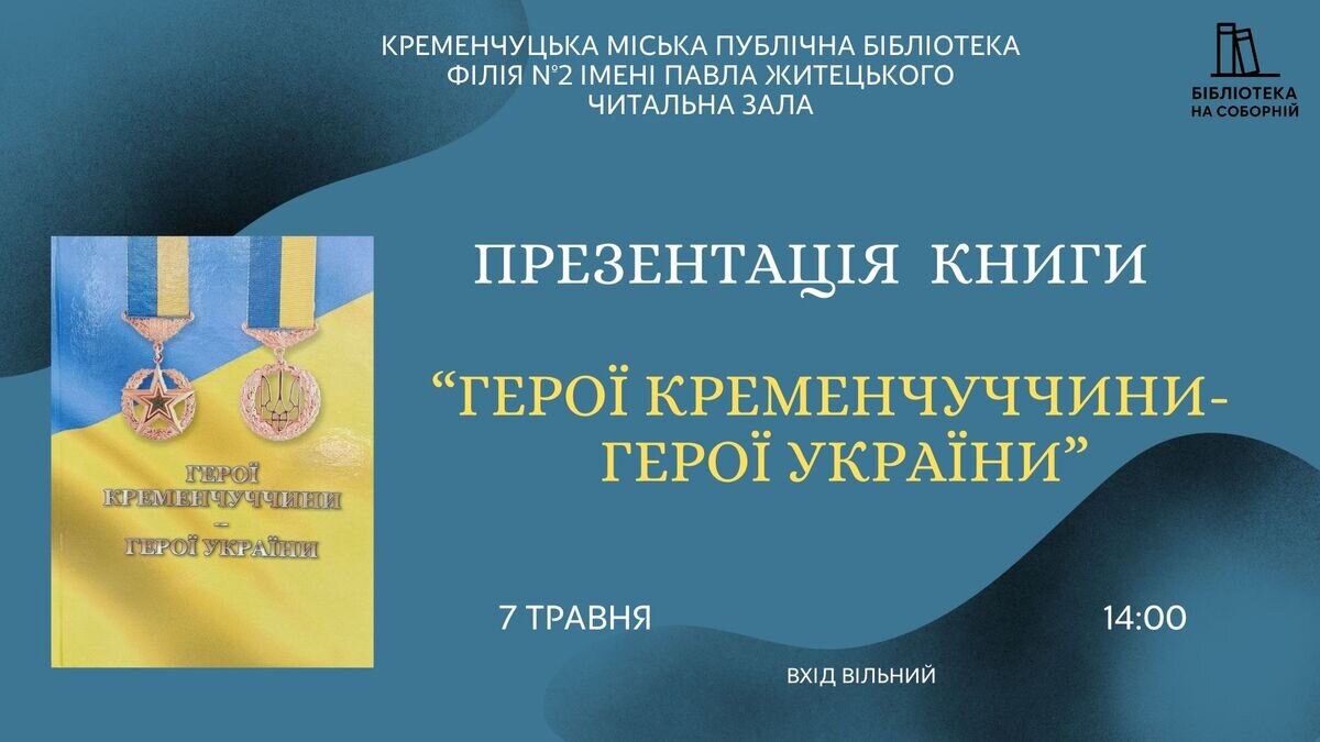 Презентація відбудеться 7 травня о 14.00 у читальній залі філії № 2 Кременчуцької міської публічної бібліотеки.