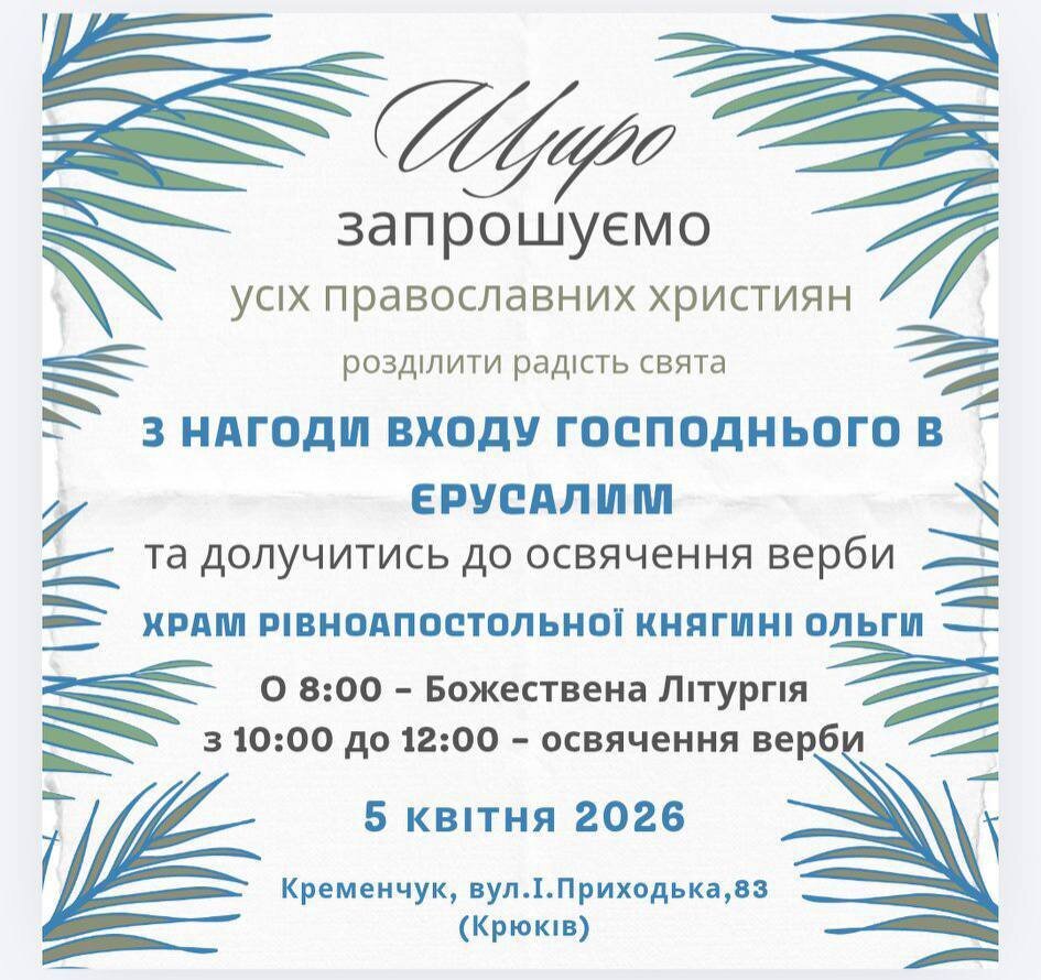 - 10.00–12.00 — освячення верби на подвір’ї храму
