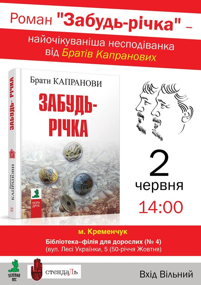 Під час презентації можна буде поспілкуватися з письменниками, придбати роман «Забудь-річка» та інші книги Братів Капранових, взяти автограф