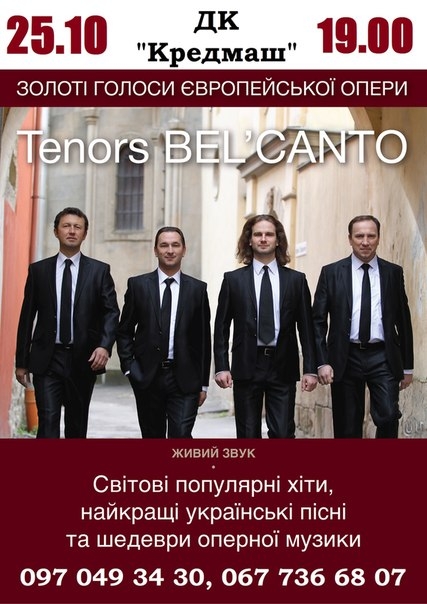 25 октября в ДК «Кредмаш»состоится концерт в исполнении известного в мире квартета Tenors Bel "CANTO". Начало концерта в 19.00.