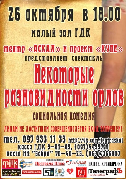 Театр «Аскал» и проект «Купе» представляют социальную комедию “Некоторые разновидности орлов».