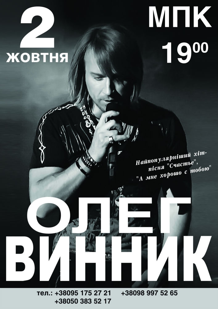 2 октября в Городском дворце культуры пройдет концерт украинского певца Олега Винника. Начало концерта в 19.00.