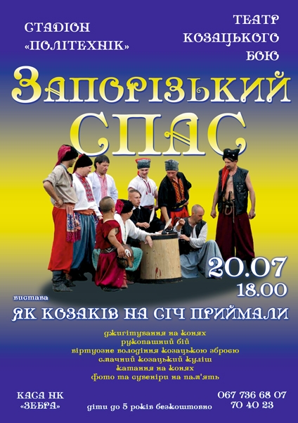 Единственный в Украине театра казацкого боя покажет юмористический казацкий быт, профессиональное исполнение украинских народных танцев, рукопашный бой, владение различными видами казацкого оружия, силовое казацкое упражнение «Кремень» и казацкую джигитовку на лошадях