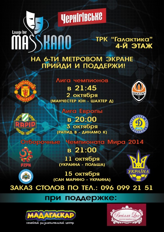 Смотритематчи Лиги чемпионов, Лига Европы и отборочные Чемпионата Мира 2014 на 6-тиметровомэкранев3D-баре"MASSKANО"