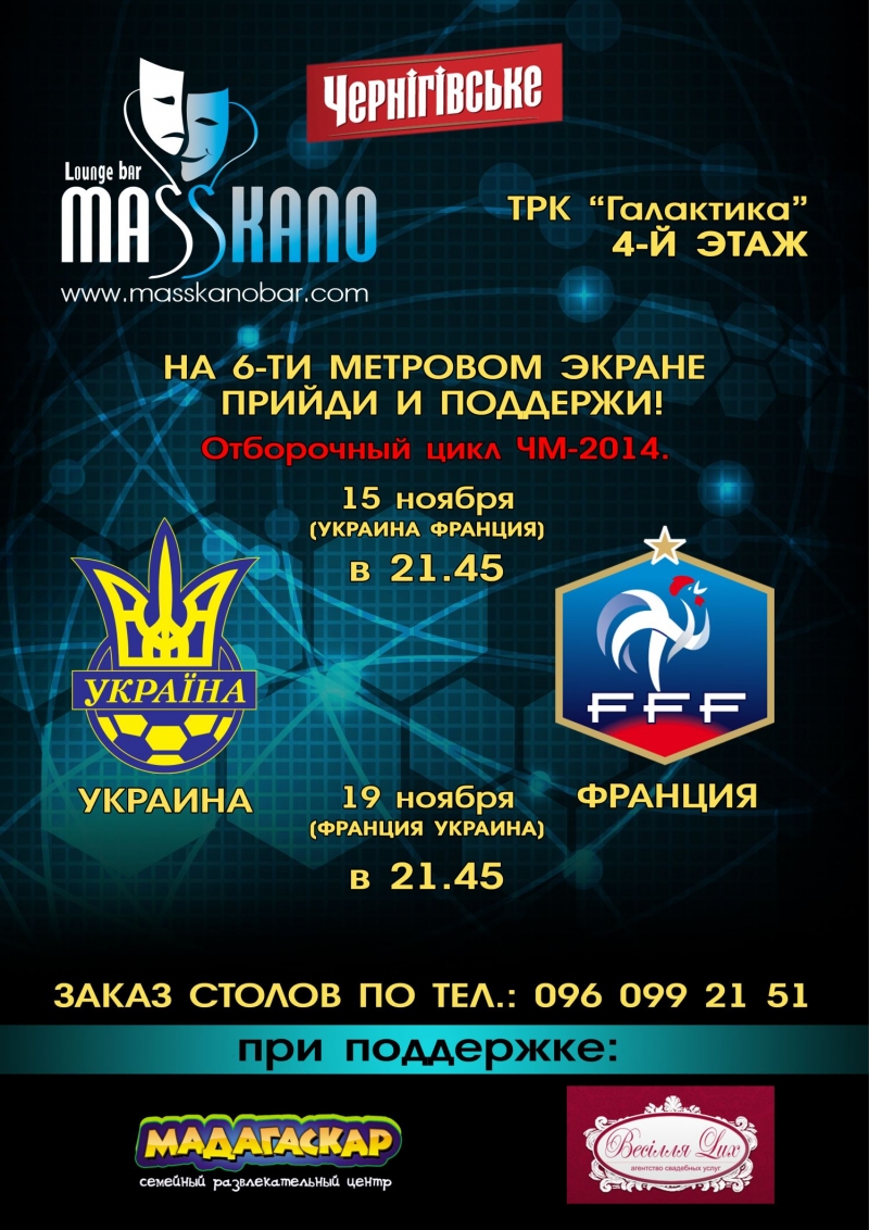 Смотри футбольные матчи на 6-ти метровом экране в лаунж-баре "MASSKANО". Прийди и поддержи