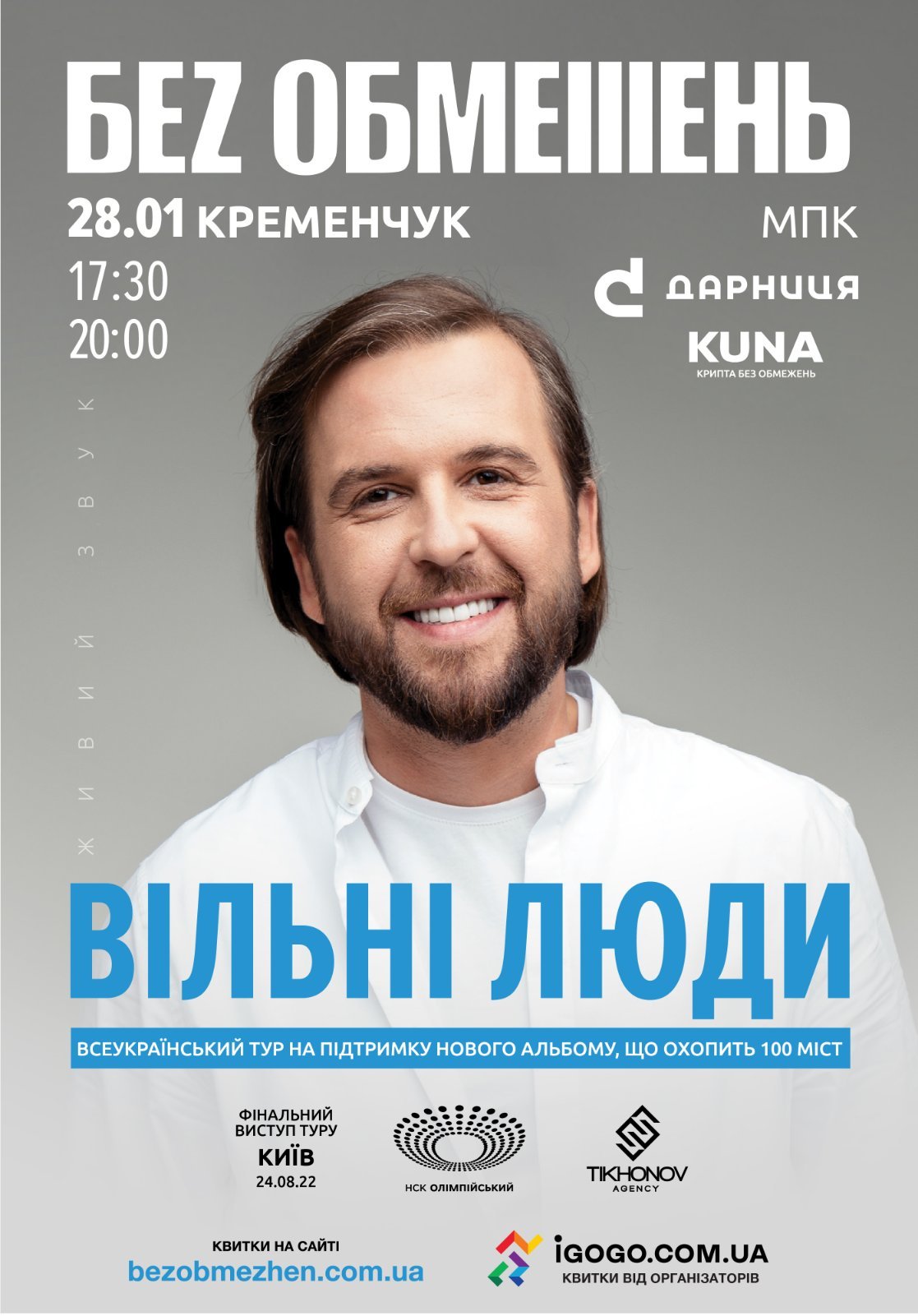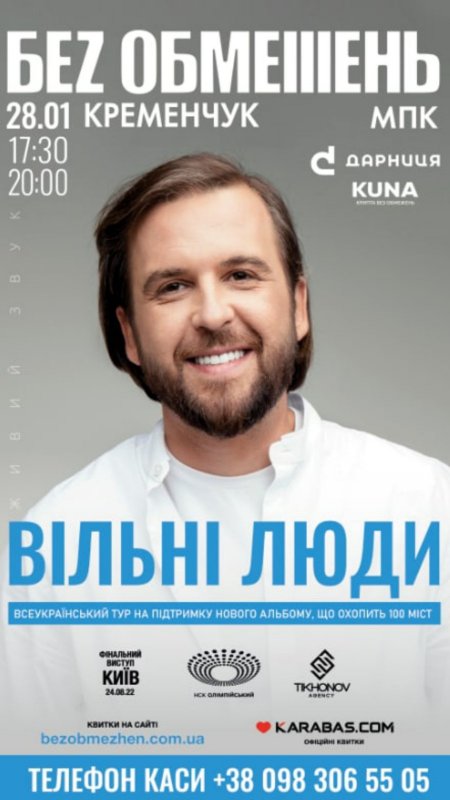 Концерт БЕЗ ОБМЕЖЕНЬ. Тур «Вільні люди» в Кременчуці відбудеться 28 січння 2022 р, о 17:30 і 20:00, Міський Палац Культури.
