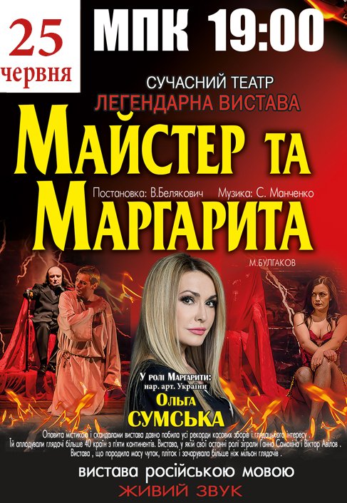 Вистава Майстер і Маргарита в Кременчуці відбудеться 25 червня 2021 р. о 19.00 в Міському Палаці Культури.