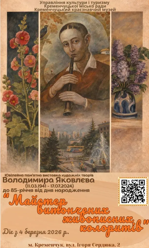 У середу, 4 березня, о 14.00 в Кременчуцькому краєзнавчому музеї відкривається пам’ятна виставка, присвячена 85-річчю з дня народження відомого кременчуцького художника-монументаліста, члена Національної Спілки художників України Володимира Михайловича Яковлєва – «Майстер витончених живописних колоритів». Про це повідомили на сторінці краєзнавчого музею у Facebook.