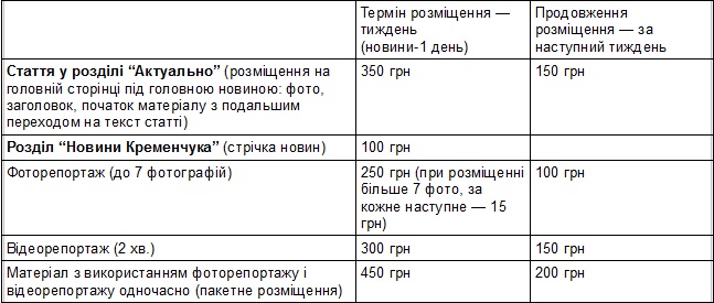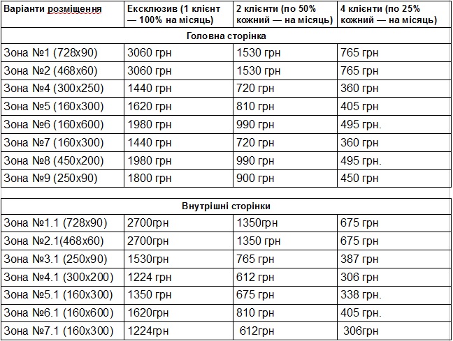 Згідно Ст. 60 та Ст. 61 Закону України “Про вибори Президента України” затверджено такі розцінки на розміщення матеріалів передвиборчої агітації на сайті “ТелеграфЪ» (www.telegraf.in.ua)