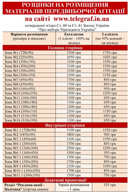 Згідно Ст. 60 та Ст. 61 Закону України “Про вибори Президента України” затверджено такі розцінки на розміщення матеріалів передвиборчої агітації на сайті “ТелеграфЪ» (www.telegraf.in.ua)